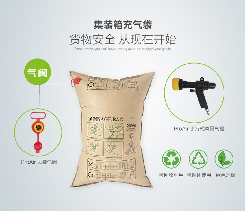 充氣袋,英文名dunnage bag,使用的集裝箱輔助運輸材料。在運輸包裝行業還有以下別稱:充氣紙袋、集裝箱牛皮紙氣囊、集裝箱緩充氣袋、充氣袋、填充氣袋、集裝箱紙襯袋、集裝箱紙氣袋、集裝箱緩沖氣袋、集裝箱防震緩沖氣袋等等。